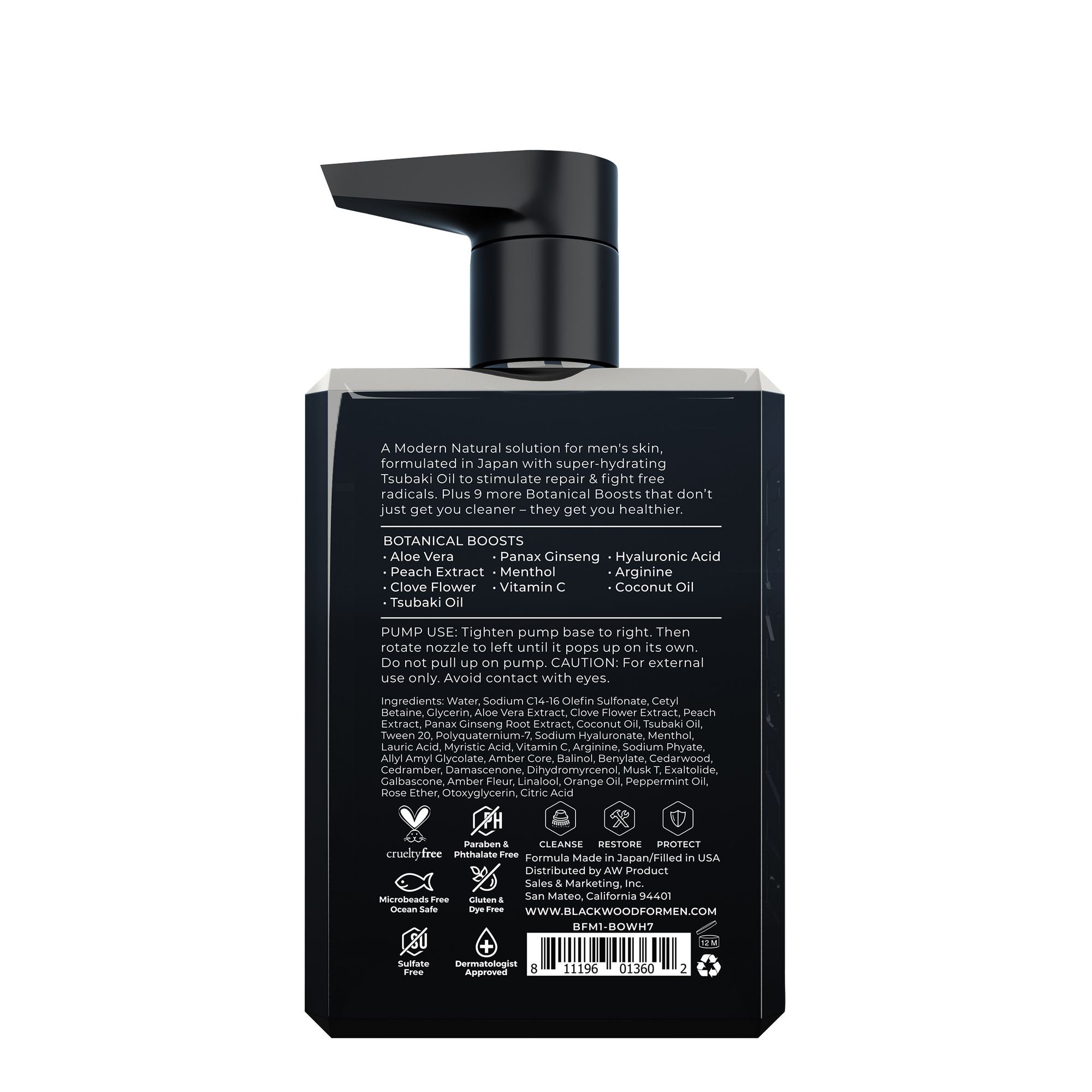 The perfect update to a potent classic. Our new Pure Moisture Body Wash features an even cleaner formula with more powerful Botanical Boosts, including Panax Ginseng & Tsubaki Oil -- two powerful antioxidants that you won't find in other men's products. Ginseng helps stimulate circulation while fighting inflammation, acne & aging signs. Tsubaki Oil penetrates skin to hydrate deep & heal complete. Working in concert with a dozen other Boosts, they create a natural symphony for skin, with Menthol to cool, Arginine to repair & Peach Leaf to protect. It's the ideal cooldown after a tough workout, or wakeup call after a long night out. Plus it lathers up quick and rinses off even quicker, with none of the filmy residue or greasiness of other body washes. Step up your shower with this unique Modern Natural solution for men's skin!